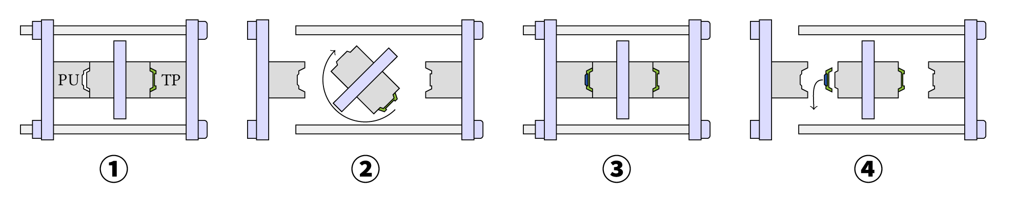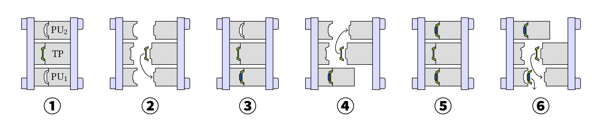 4 . 模腔PU1保持闭合状态。热塑性塑料基体转移到模腔PU2。